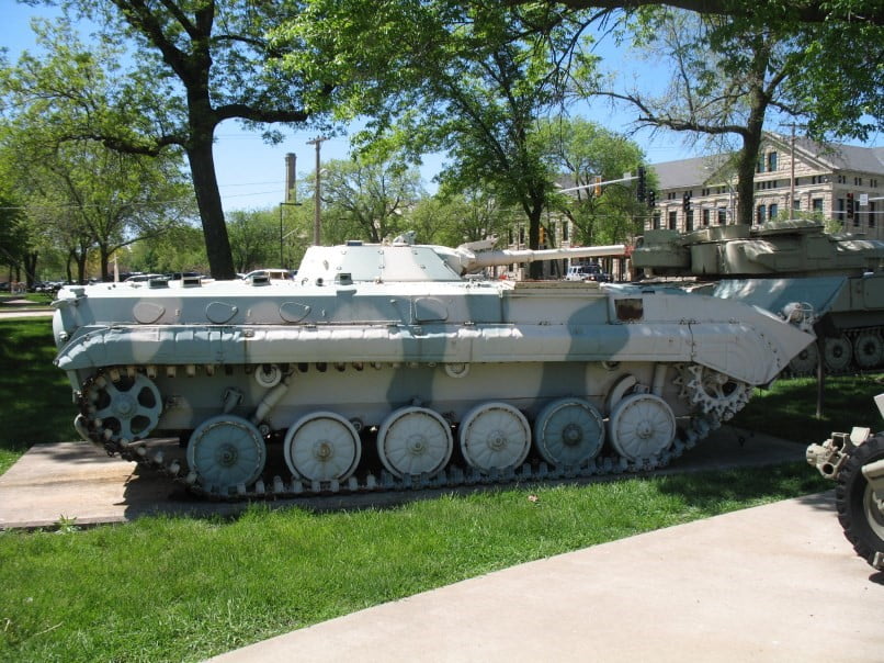 The BMP-1 Armored Personnel Carrier was developed by the Soviet Union in the early 1960s, and the BMP-1 Model 1970 is the primary production variant. It is an amphibious vehicle designed to accompany tanks in an assault and beyond the objective. The main armament is an M2A28 73MM gun with a Sagger missile mounted on top. The BMP-1 displayed at Memorial Field saw service with the Iraqi Army during the Gulf War and was found abandoned west of Kuwait City, Kuwait.